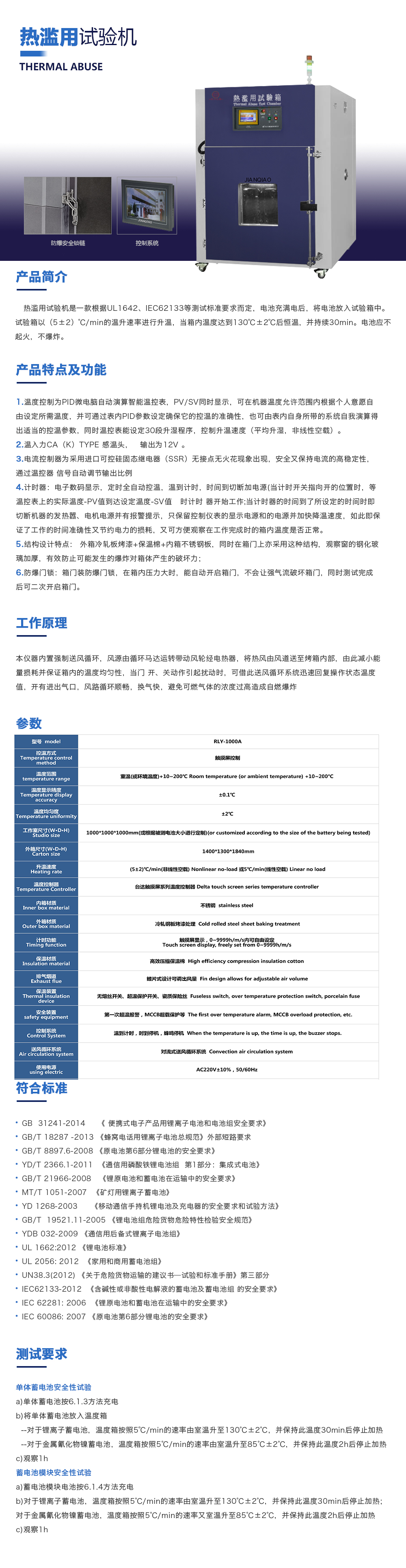 產(chǎn)品型號(hào):JQ-8103 品牌:劍 喬 用途:熱濫用試驗(yàn)箱是一款根據(jù)UL1642、IEC62133等測(cè)試標(biāo)準(zhǔn)要求而定,電池充滿(mǎn)電后,將電池放入試驗(yàn)箱中。試驗(yàn)箱以(5±2)℃/min的溫升速率進(jìn)行升溫,當(dāng)箱內(nèi)溫度達(dá)到130℃±2℃后恒溫,并持續(xù)咨詢(xún)熱線(xiàn):13829135130