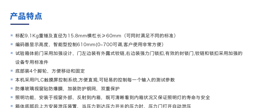 產(chǎn)品型號(hào):JQ-8116(定制款) 品牌:劍 喬 用途:電池重物沖擊試驗(yàn)機(jī)是模擬通過(guò)從不一同的高度的不同的重錘和不同的受力面積測(cè)試電池的安全性能,按規(guī)定進(jìn)行試驗(yàn),電池應(yīng)不起火、不爆炸。也是各電池廠家及研究所必不可少的檢咨詢熱線:13829135130