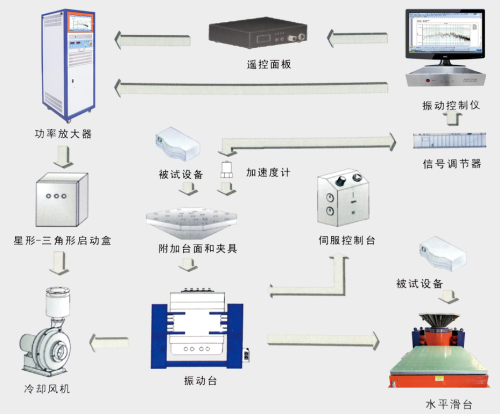振動臺系統(tǒng)有幾大部分組成功率放大器(簡稱功放)控制儀、振動臺、附加臺面及夾具、制冷單元(有冷卻風(fēng)機、水冷裝置)、傳感器、水平滑臺。