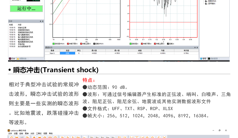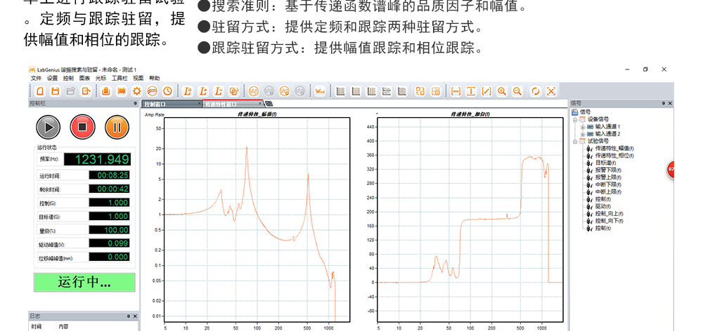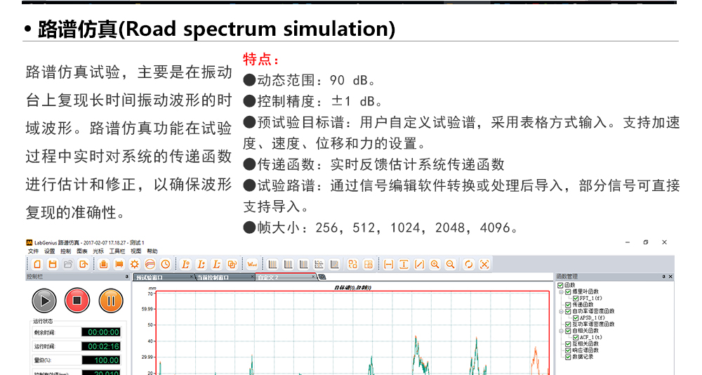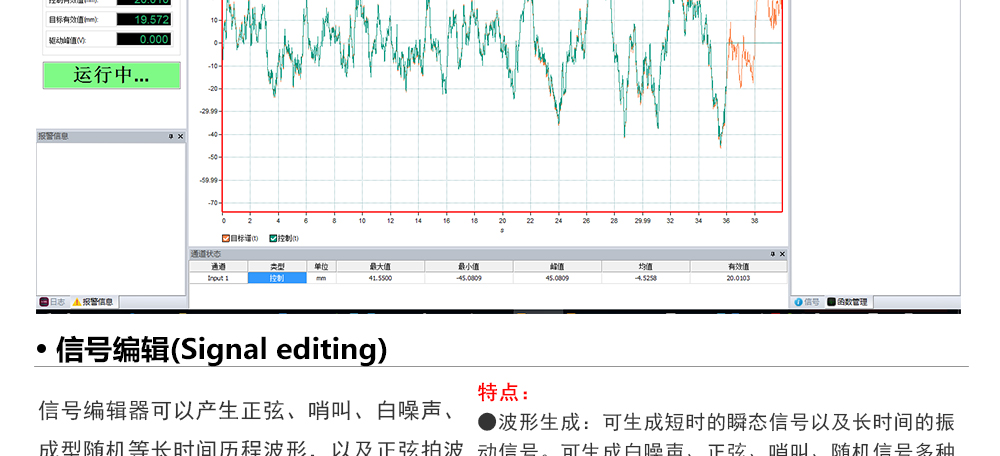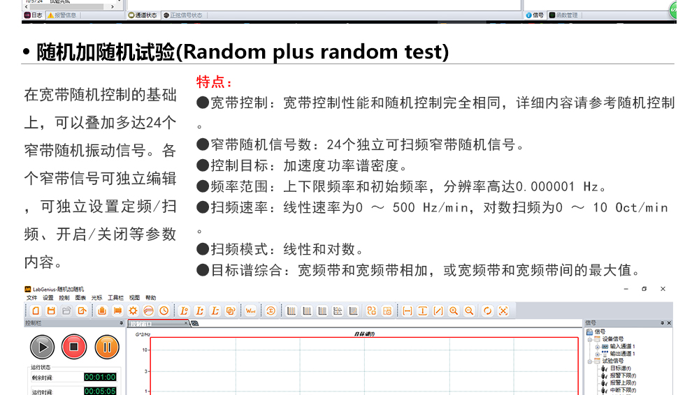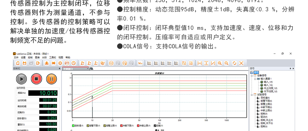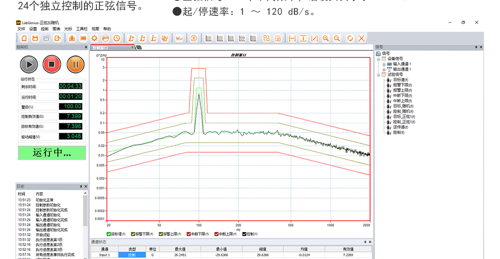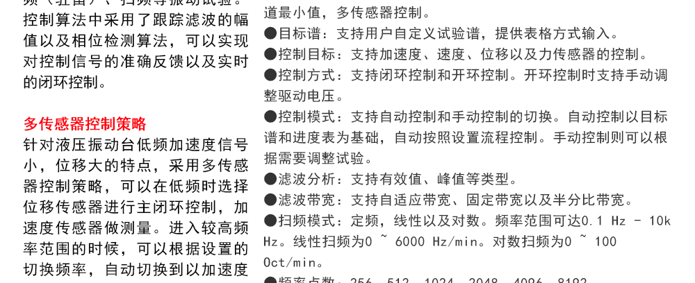 用途:正弦試驗可以控制振動臺實現定頻(駐留)、掃頻等振動試驗。控制算法中采用了跟蹤濾波的幅值以及相位檢測算法,可以實現對控制信號的準確反饋以及實時的閉環控制。