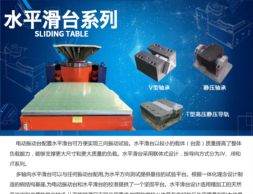 用途:振動臺配置水平滑臺可以實現三向振動試驗,也可以配合溫濕試驗箱形成復合環境試驗系統。多軸向水平滑臺可以與任何振動臺配用,為水平方向測試提供最佳的試驗平臺。根據一體化理